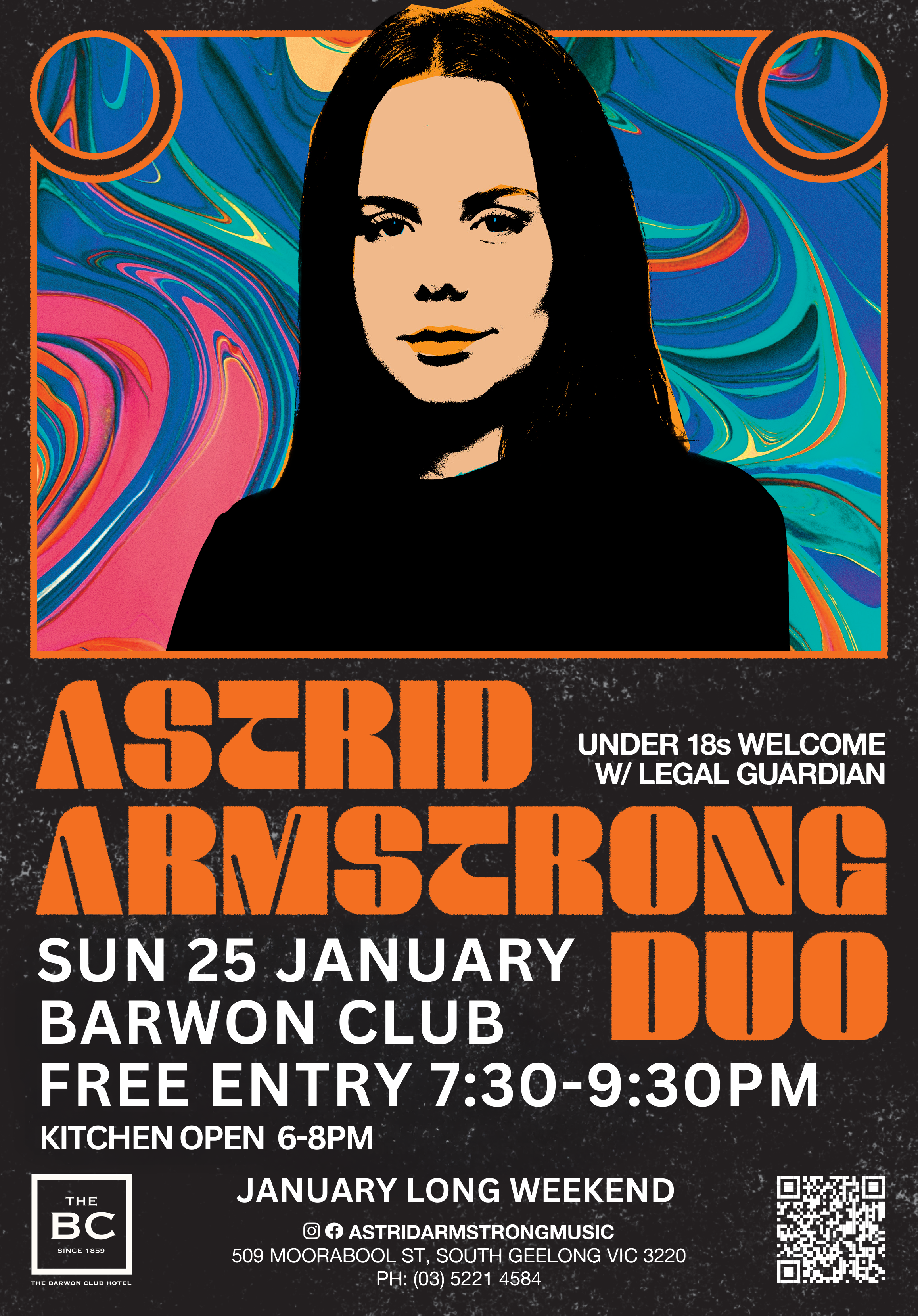 Astrid Armstrong Duo is back at Barwon Club Hotel on Sunday 25th January for a night of live music in the beer garden. Join Astrid and Oscar Rose as they play pop, soul, R&B, roots and a touch of funk.