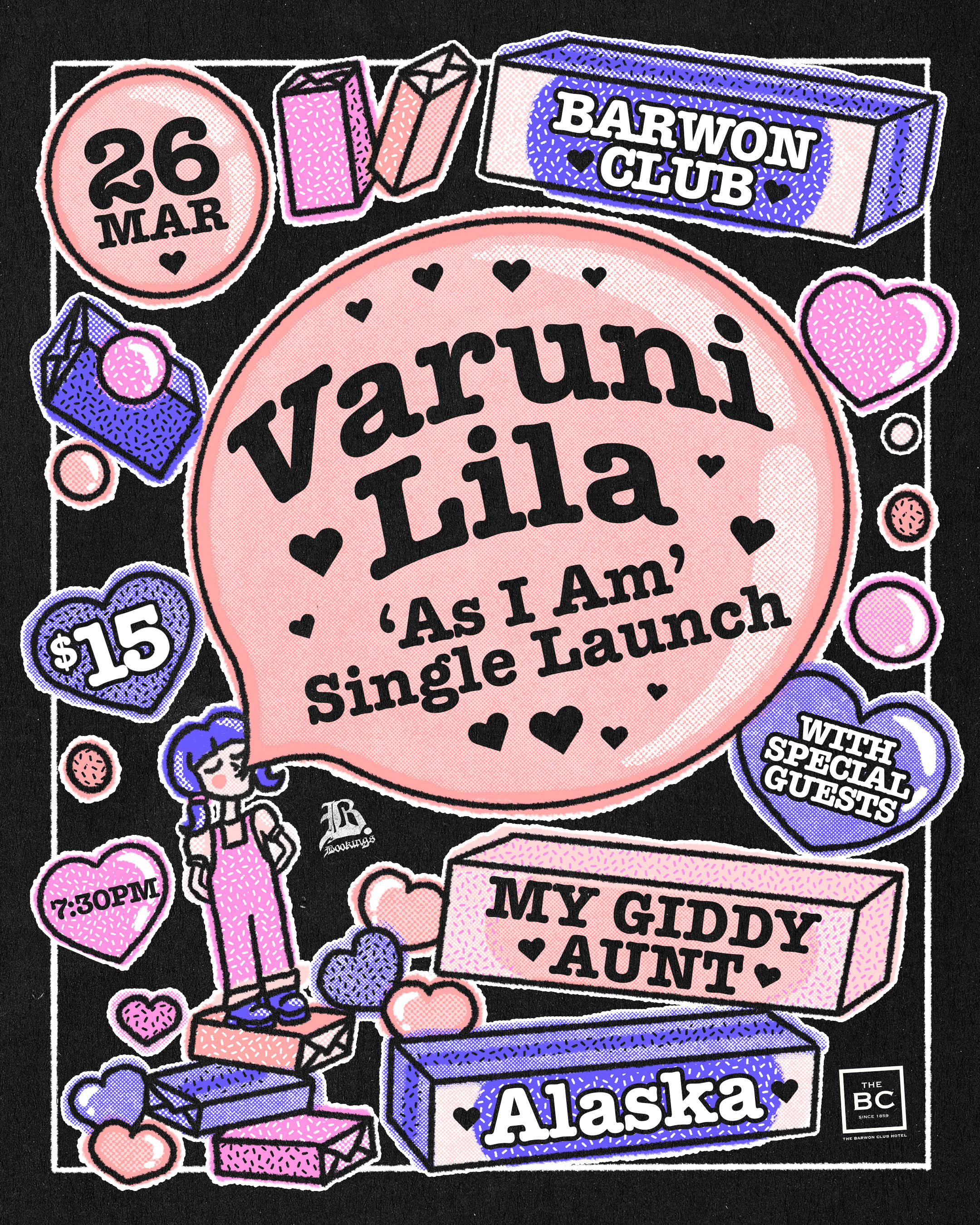Join VARUNI LILA at her “As I Am” single launch at the Barwon Club Hotel Thursday 26th March where she’ll be supported by ALASKA and MY GIDDY AUNT