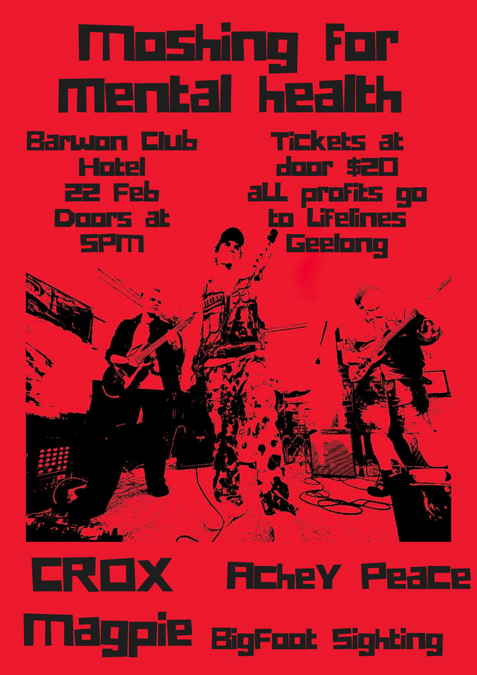 Moshing For Mental Health Fundraiser event Sunday 22nd of February at The Barwon Club is a night to celebrate Geelongs growing youth music scene by supporting the amazing work done by Lifeline Australia and to raise awareness for mental health supports, All proceeds of the event being donated to Lifeline Australia.