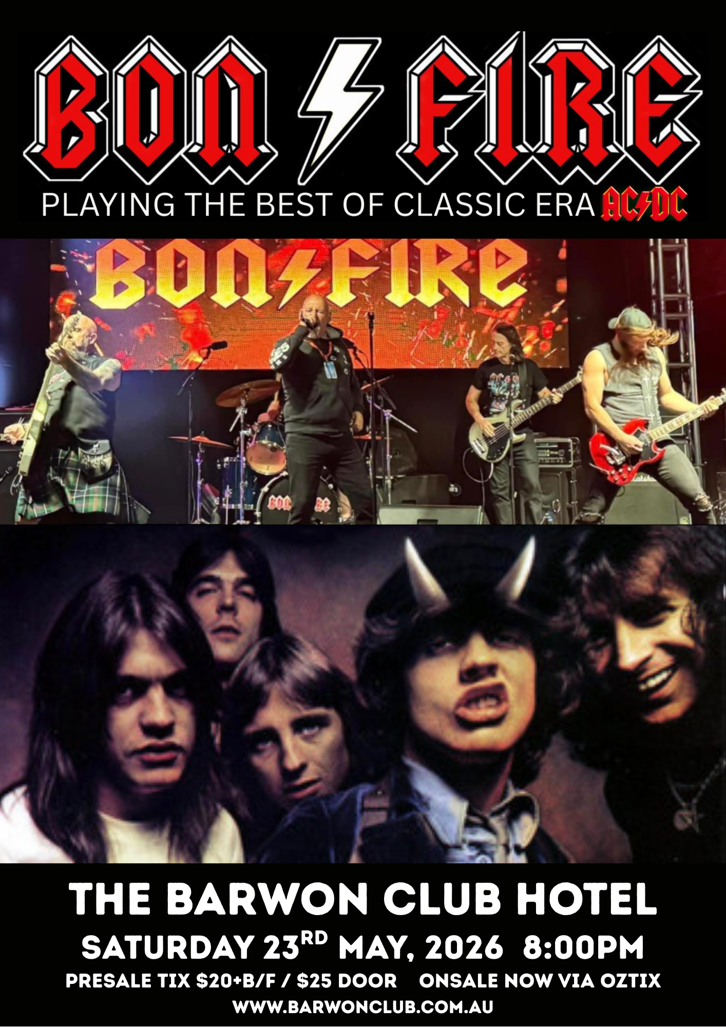 BON FIRE is South Australia’s and quite possibly Australia’s premier AC/DC tribute band, their Victorian tour sees them perform for the very first time in Geelong at the Barwon Club Hotel on Saturday 23rd May, 2026 playing 2 sets from 8pm.