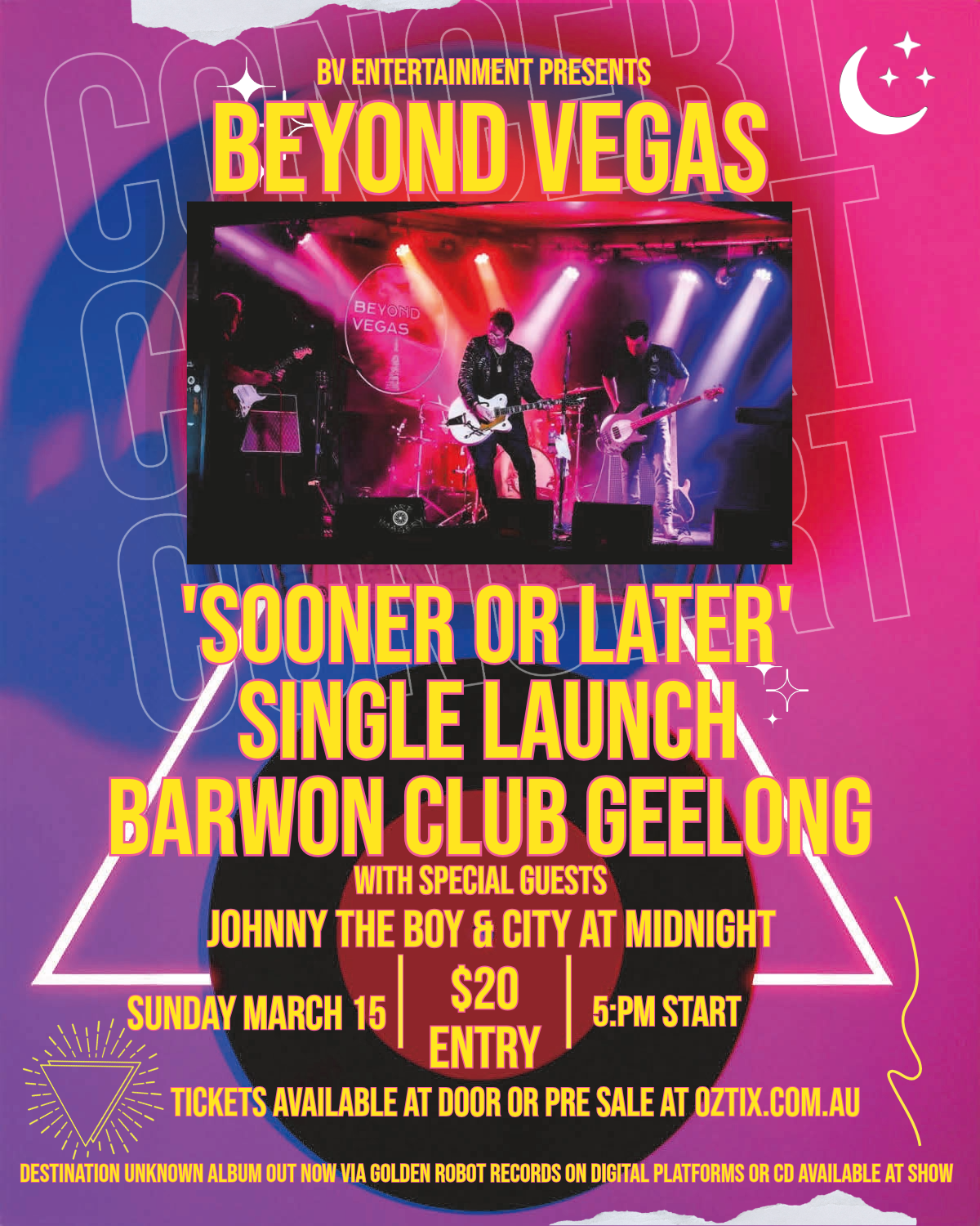 Beyond Vegas the rocking 5 piece outfit return to the Barwon Club Sunday 15th March to launch latest single Sooner Or Later.